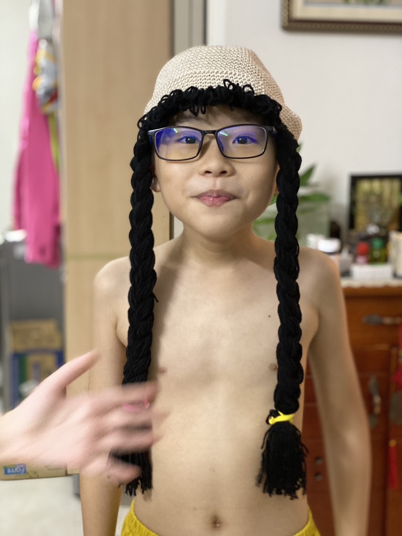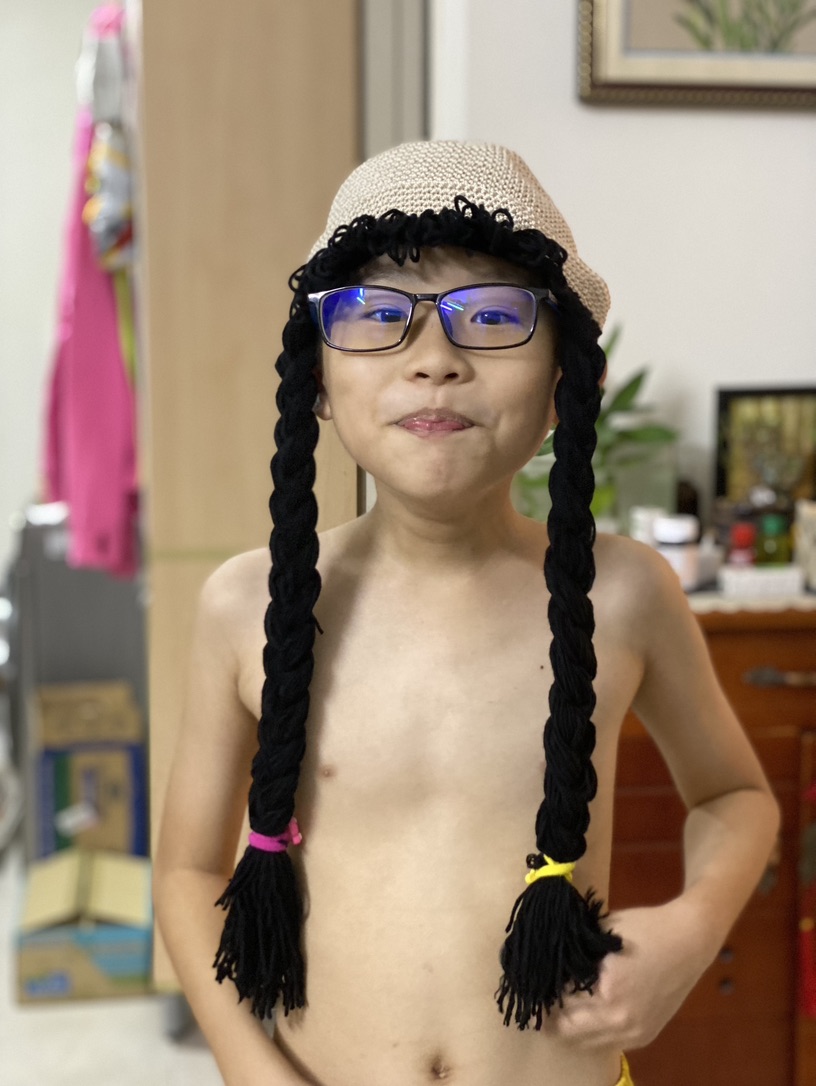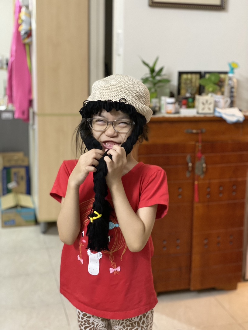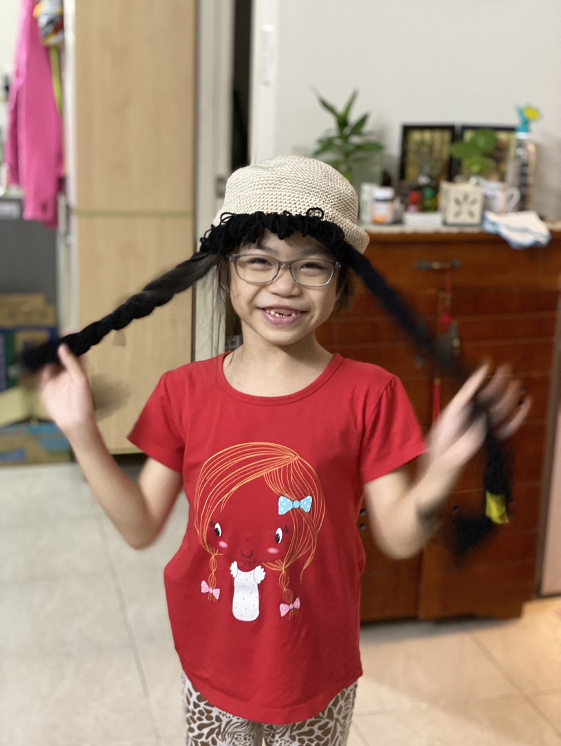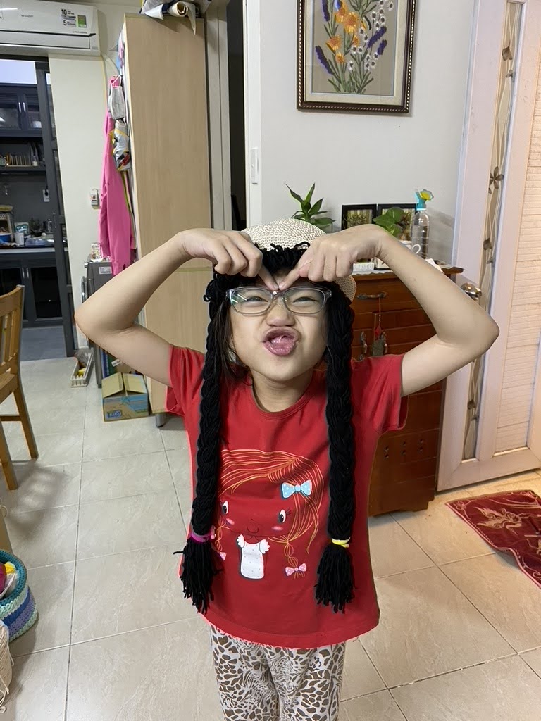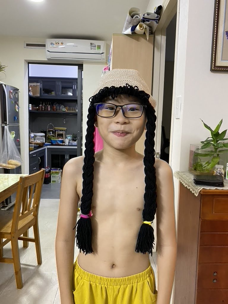 Tụi nhỏ đội nón tóc dài mẹ làm